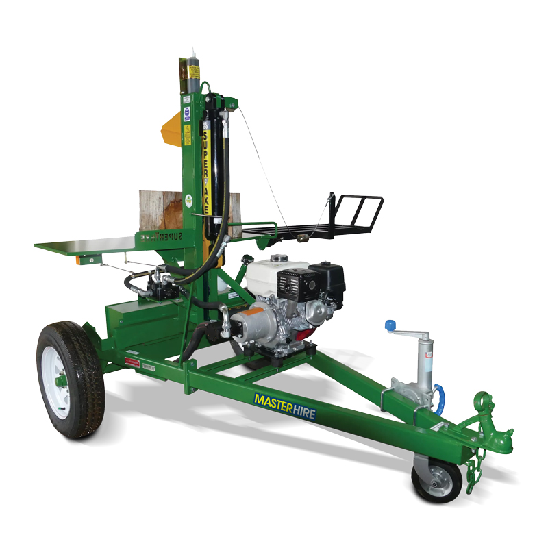Master Hire trailer mounted log splitters, also known as a block splitter, wood splitter, or firewood splitter, are hydraulically driven by a powerful petrol engine. For larger logs too heavy to lift by hand, there is a built in hydraulic lifter, capable of lifting up to as much as 200kg to make your job easier. The vertical blade with wedge design, easily splits the toughest Australian hardwood logs into firewood and is able to handle different lengths of wood up to 500mm. The unit is equipped with a 9hp – 13h engine delivering 21t of splitting power and a 7 second cycle time. The machine’s dimensions average 2500mm long, 1500mm wide and 1700mm high and is capable of being towed behind any vehicle with a towing capacity greater than 750kg.